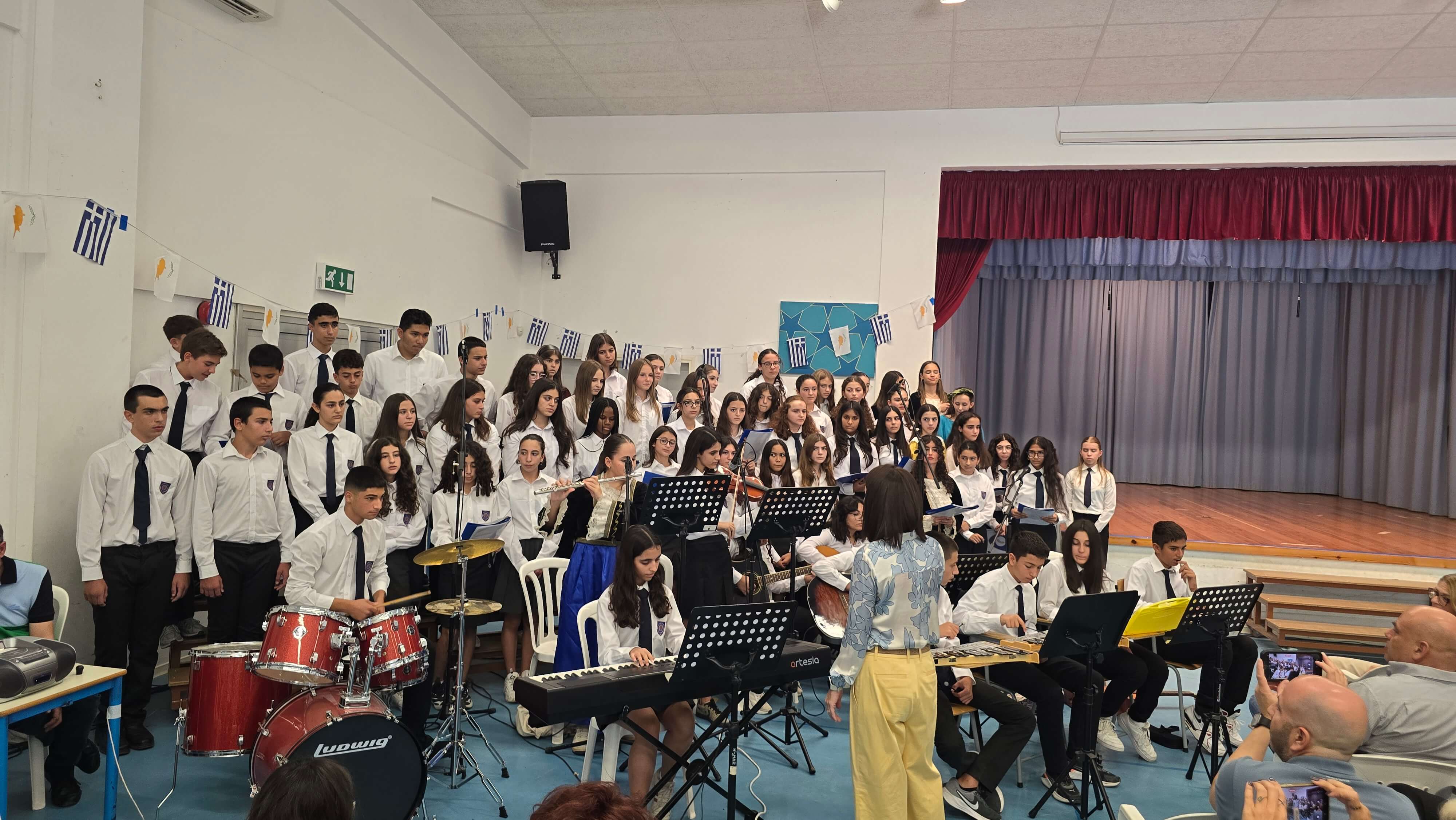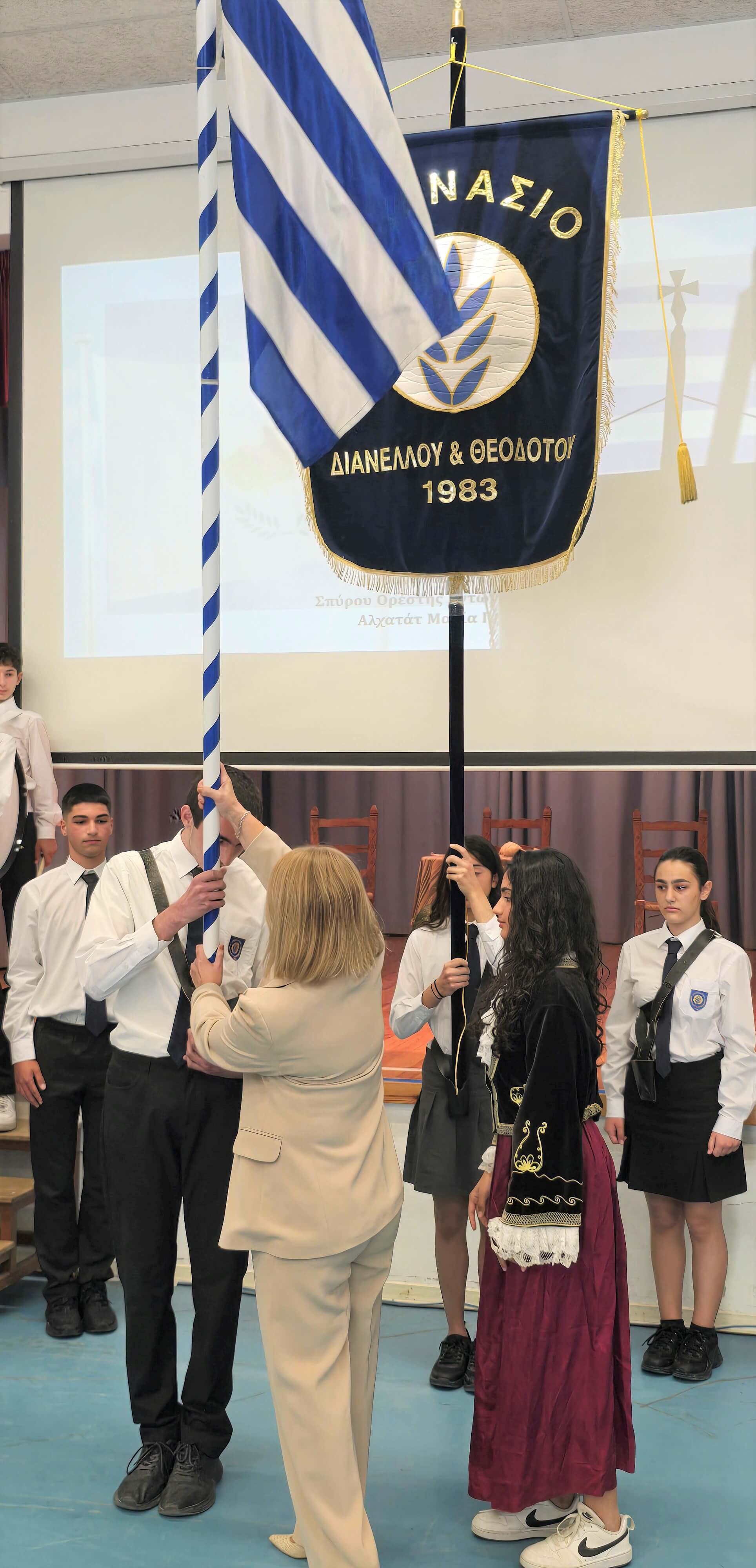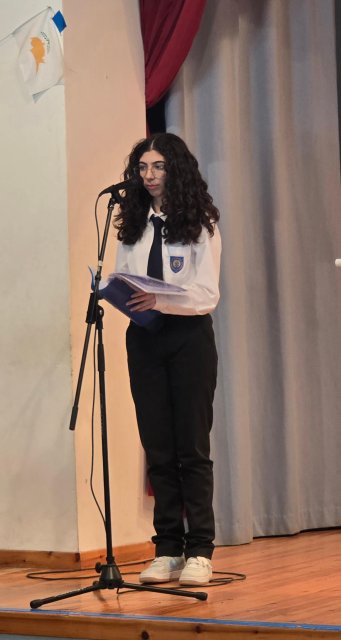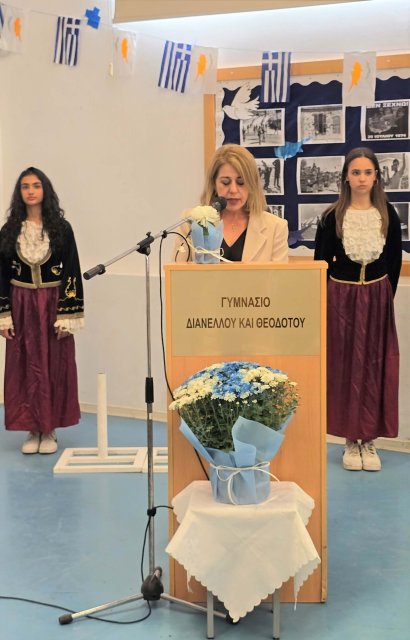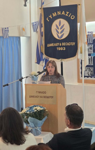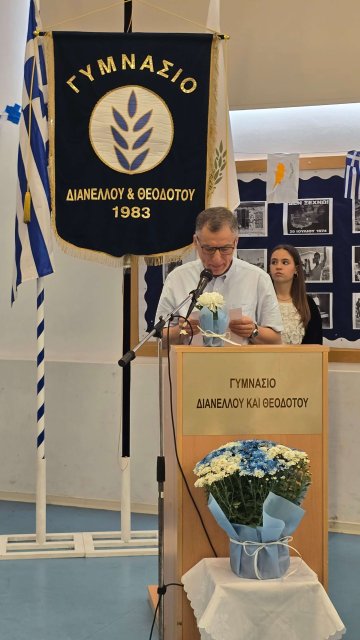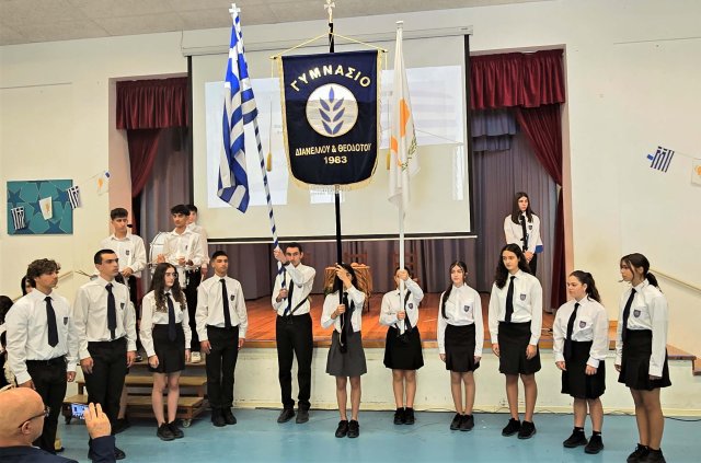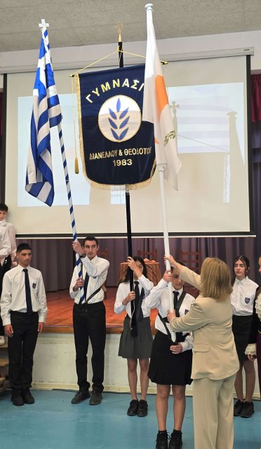 Τη Δευτέρα, 27 Οκτωβρίου 2025, πραγματοποιήθηκε με επισημότητα η Εορτή της Σημαίας, κατά την οποία ανακηρύχθηκαν οι Σημαιοφόροι και οι Παραστάτες του Γυμνασίου Διανέλλου και Θεοδότου. Ακολούθως, τιμήσαμε την Εθνική Επέτειο της 28ης Οκτωβρίου 1940, όταν η Ελλάδα όρθωσε το αγέρωχο «Όχι» απέναντι στην Ιταλία και εισήλθε στον Β΄Παγκόσμιο Πόλεμο πανηγυρίζοντας ωσάν να είχε ήδη νικήσει. Η ένδοξη αυτή επέτειος μας θυμίζει τον ηρωισμό που χρειάζεται η υπεράσπιση της εθνικής μας αξιοπρέπειας σε κάθε ιστορική περίσταση. Οι μαθητές και οι μαθήτριες ανέλαβαν την παρουσίαση ενός Ιστορικού Χρονικού με ντοκουμέντα, ποίηση, μουσική, χορό και θέατρο για τον πόλεμο του ΄40, την κατοχή στην Ελλάδα και τη συμβολή Κυπρίων στον Β΄ Παγκόσμιο Πόλεμο. Την εκδήλωση διοργάνωσαν οι Φιλόλογοι Αλεξία Αλεξάνδρου και Νίκη Χριστοδούλου.