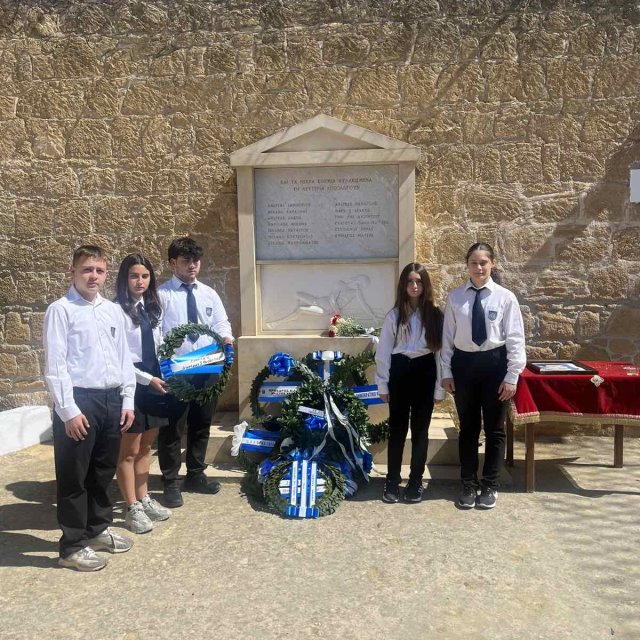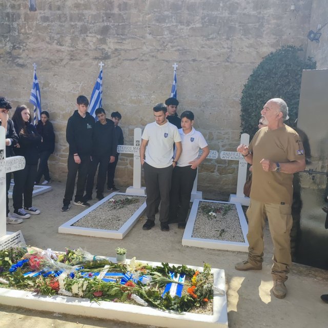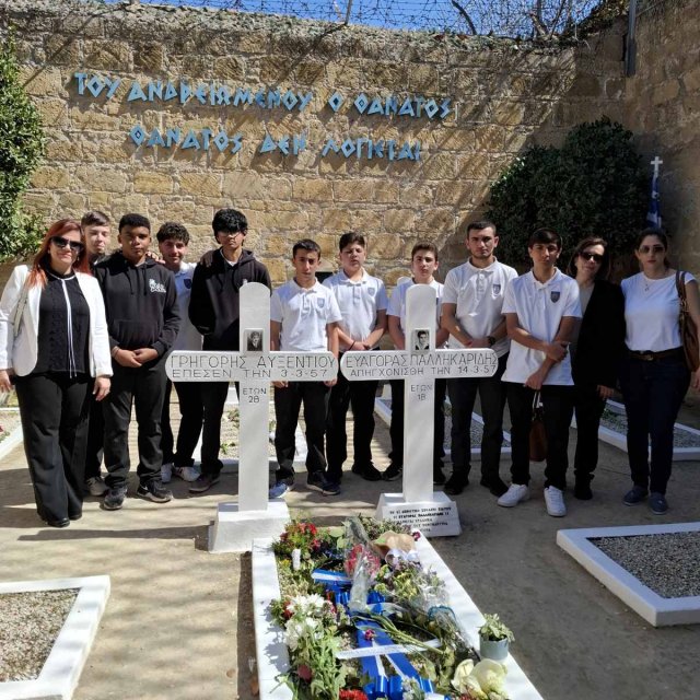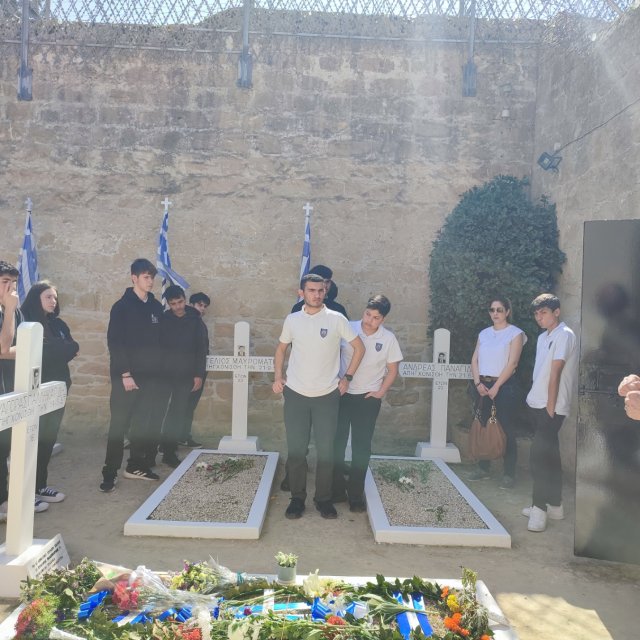 Την Πέμπτη 13/3/2025, Ημέρα Μνήμης Ηρώων Μαθητών, οι μαθητές της Γ΄ τάξης του σχολείου μας, επισκέφθηκαν τα Φυλακισμένα Μνήματα. Σημαντική είναι αδιαμφισβήτητα η συμβολή των ηρώων μαθητών της Κύπρου, κατά τον απελευθερωτικό αγώνα της Ε.Ο.Κ.Α. Νεαροί μαθητές εγκαταλείπουν τα θρανία τους, κλείνουν τα βιβλία τους, ξεχύνονται στους δρόμους, γράφουν συνθήματα στους τοίχους, προκαλώντας τον Χάροντα σε μια άνιση αναμέτρηση, γράφοντας ταυτόχρονα με χρυσά γράμματα τηδική τους ιστορία. Η ξενάγηση στον χώρο ήταν ιδιαίτερα συγκινητική και οι μαθητές παρακολούθησαν με ιδιαίτερο ενδιαφέρον την έκθεση που ήταν αφιερωμένη στον ήρωα μαθητή Ευαγόρα Παλληκαρίδη, ο οποίος ανέβηκε περήφανα το ικρίωμα της αγχόνης του κατακτητή, δίνοντας μαθήματα λεβεντιάς και αντρειοσύνης. Τέλος, το Κεντρικό Μαθητικό Συμβούλιο κατέθεσε στεφάνι στον χώρο του κοιμητηρίου, όπου είναι θαμμένοι δεκατρείς ήρωες της Ε.Ο.Κ.Α.