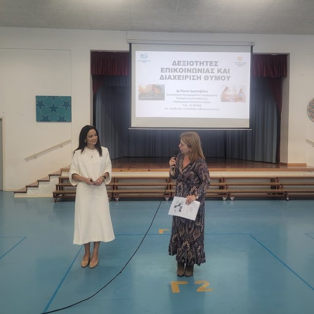 Χριστοφίδου, Συντονίστρια Προγραμμάτων Επιμόρφωσης Στελεχών της Εκπαίδευσης. Η κ. Χριστοφίδου αναφέρθηκε στην έννοια της επικοινωνίας και στους παράγοντες που λειτουργούν ως εμπόδια στην επικοινωνία μέσα στο σχολείο. Συζητήθηκε ο ρόλος της ενσυναίσθησης και της εμπιστοσύνης ως προϋπόθεση για την αποτελεσματική επικοινωνία με τον εαυτό, με τους μαθητές και τις μαθήτριες, με τους/τις εκπαιδευτικούς και με τους γονείς και προσφέρθηκαν εισηγήσεις και τεχνικές.