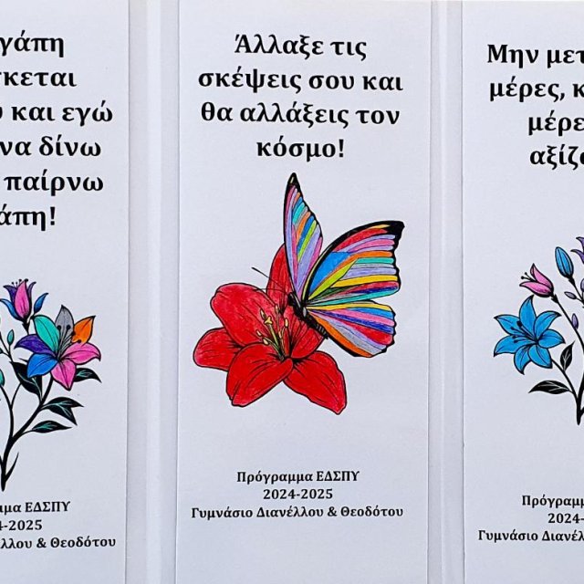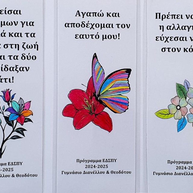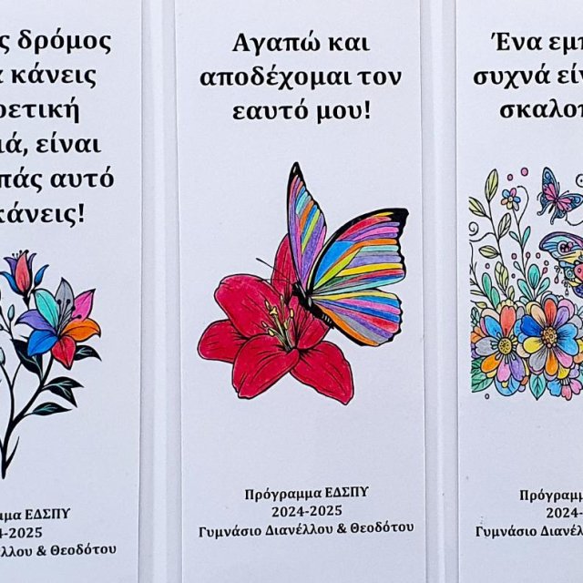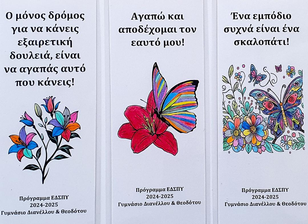 Οι μαθητές και μαθήτριες του προγράμματος «ΕΔΣΠΥ» δημιούργησαν σελιδοδείκτες με αισιόδοξα μηνύματα για την ζωή και τα δώρισαν στους καθηγητές τους, σε συμμαθητές τους αλλά και στο προσωπικό του σχολείου. Είναι επιτακτική ανάγκη να έχουμε στο μυαλό μας κάποιες θετικές φράσεις και αποφθέγματα που μπορούν να μας βοηθήσουν να ξαναδούμε με αισιοδοξία και θετικότητα τη ζωή.